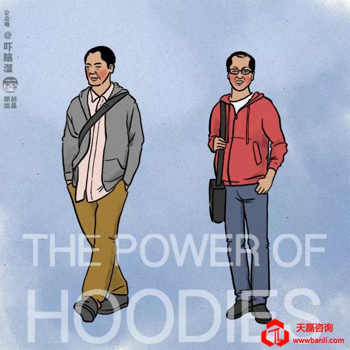 两件连帽衫的叠加混搭的穿法,可能只有互联网公司才有。